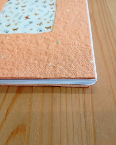 -Portades creades a partir del paper artesanal que creem dels excedents de cartolina de l'activitats a l'àrea de l'art, en tons taronjes.