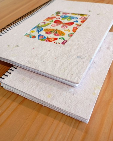 -Portades creades a partir del paper artesanal que creem dels excedents de cartolina de l'activitats a l'àrea de l'art, en tons taronjes.