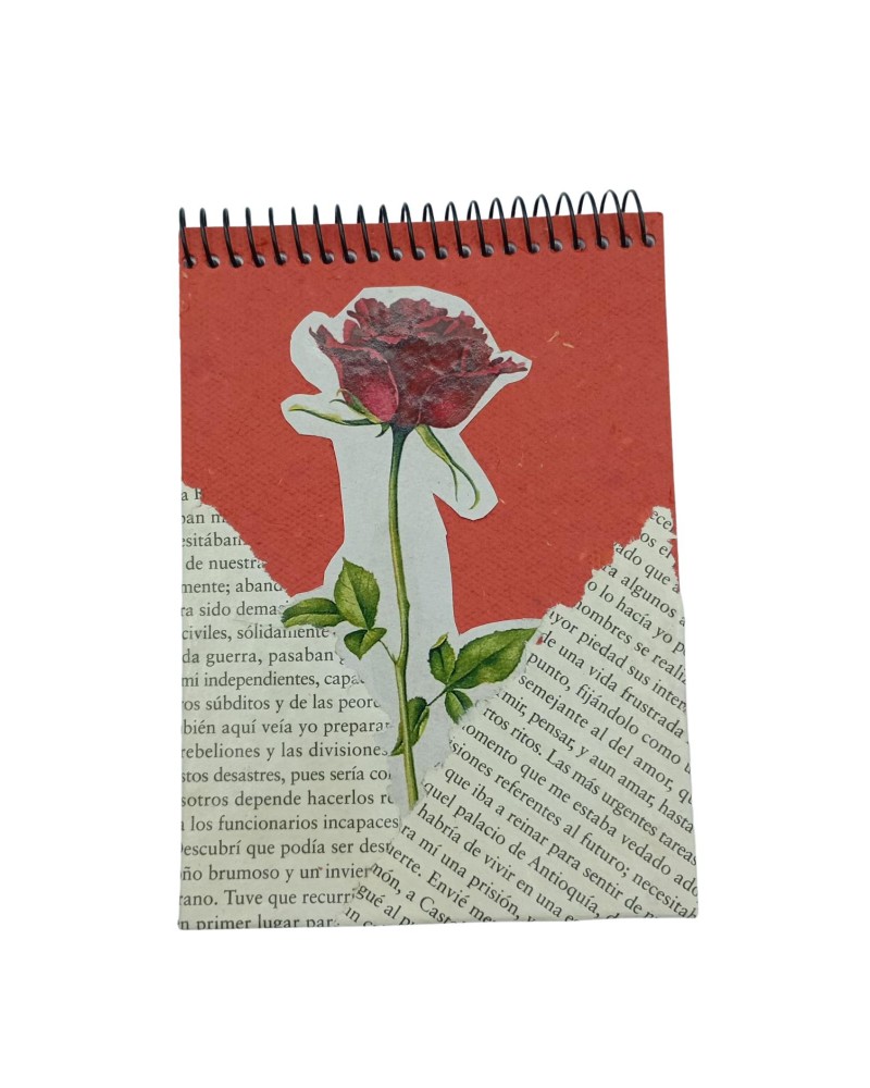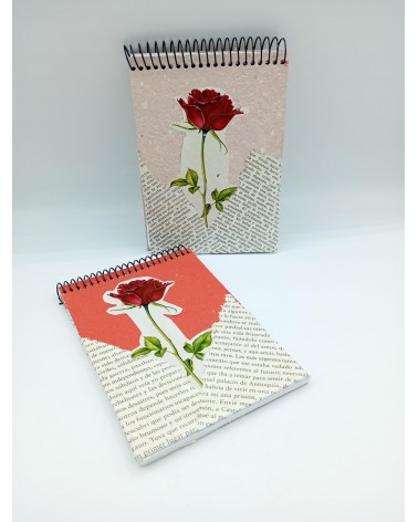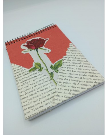 -Llibreta mida DinA6 amb imatge d'una rosa i paper de llibre antic. Regal ideal pel dia de Sant Jordi.