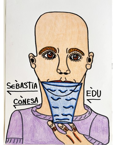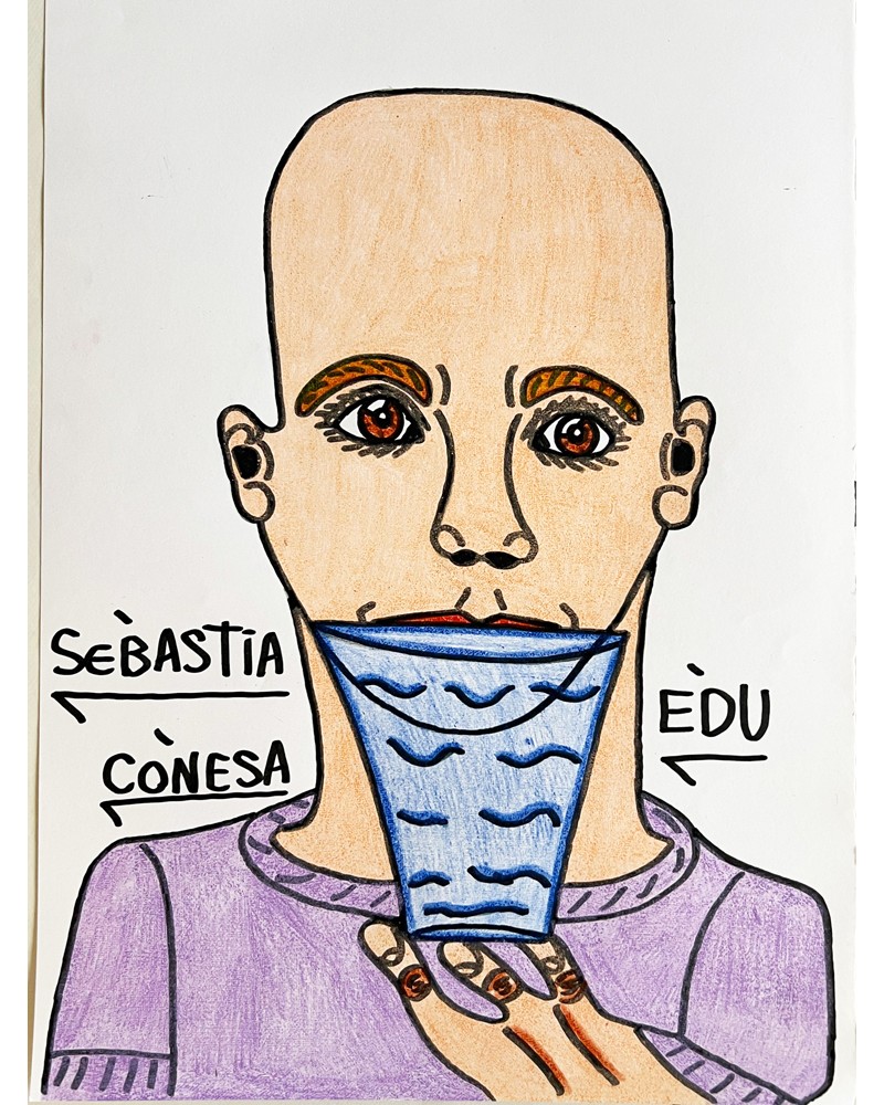 “En Sebastià dibuixa els pensaments que l’acompanyen, presentant sèries on plasma idees i records que se li revelen. Sovint hi apareixen els rostres de les persones del seu dia a dia, representats amb retoladors i colors aplicats de manera minuciosa i detallada.”